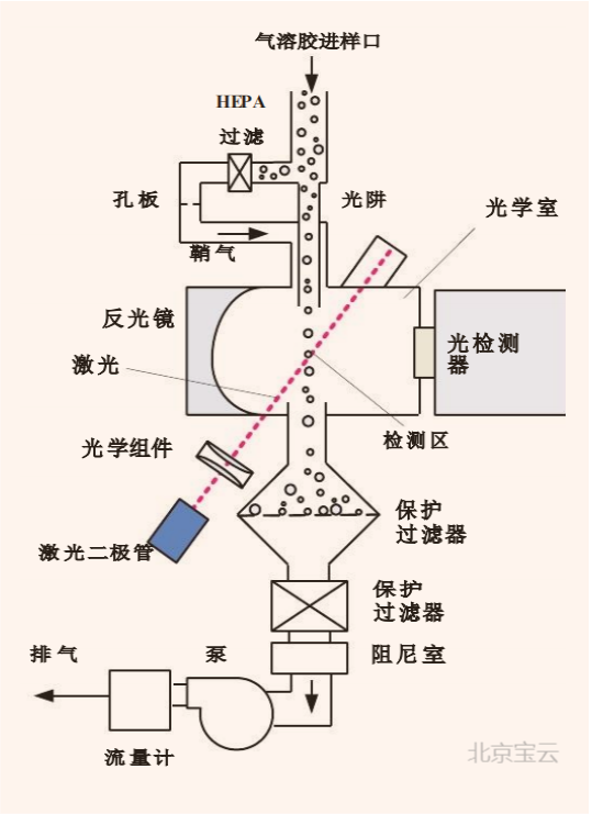 DUSTTRAK™II 8530/8532,8533/8534型气溶胶监测仪是用于实时气溶胶质量浓度检测的单通道光度计检测仪。其中8530(测量范围高达400mg/m³)是台式型号,而8532是量程为150mg/m³的手持式型号。如下方原理示意图所示,泵的连续采样流量为3L/min,待测气溶胶被吸入检测室。其中1L/min的采样流量进入旁路并经过过滤器过滤后作为鞘气再次包裹着另外2L/min的待测样品进入检测室。