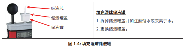 2.2.2确定湿球湿度计的储水槽注入蒸馏水,确保棉芯干净并且充分浸湿,注意不能添加自来水。(见图1-4)